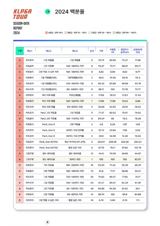 '2024 주요기록'은 2024시즌 스트로크게인드 기록을 바탕으로 전반적인 샷 역량을 한눈에 파악할 수 있도록 했다. '2024 백분율'에서는 티샷, 어프로치, 그린주변, 퍼팅 등 샷 상황 및 거리에 따라 250여개에 달하는 세부 기록의 순위와 등급을 확인할 수 있다.