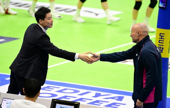 강성형(왼쪽) 현대건설 감독과 마르첼로 아본단자 흥국생명 감독이 경기 전 악수하고 있다. /사진=한국배구연맹(KOVO) 제공