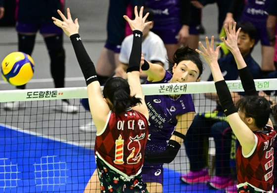 김연경(가운데)이 스파이크를 시도하고 있다. /사진=한국배구연맹(KOVO) 제공