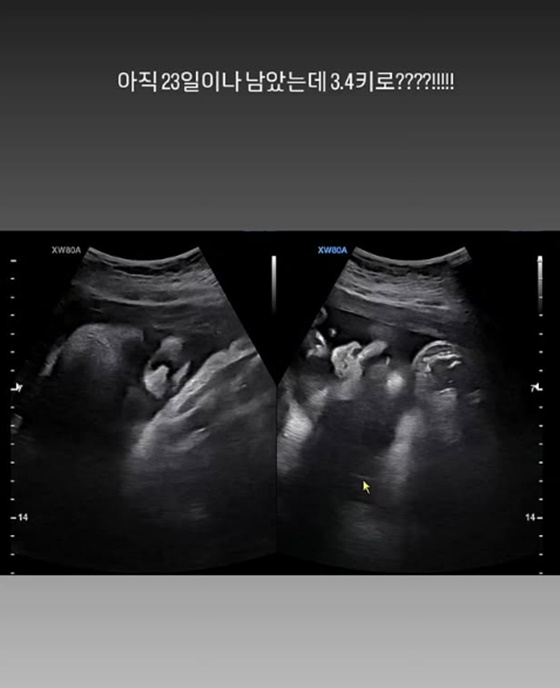 같은 날 정주리는 출산을 앞두고 태아의 근황도 전했다. 그는 아이 초음파 사진을 공개하며 "아직 (출산) 23일이나 남았는데 3.4kg????!!!!!"이라고 했다.
