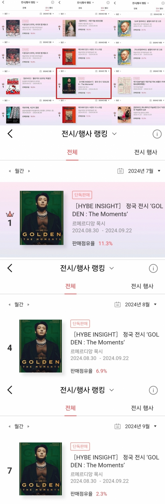 인터파크가 발표한 '전시/행사 랭킹' 부문에 따르면, 정국의 솔로 전시 '골든 : 더 모멘트'<'GOLDEN : The Moments'>는 2024년 7월 월간 베스트셀러 1위로 나타났다.