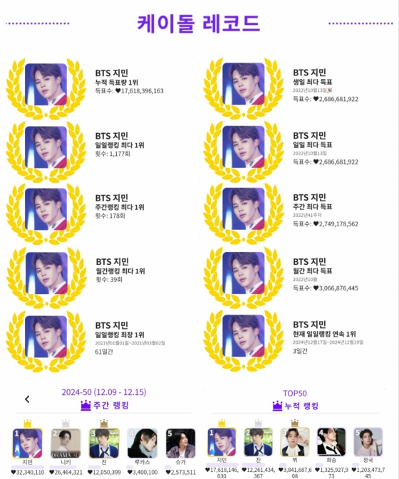 지민은 글로벌 K팝 팬들을 대상으로 하는 아이돌 인기투표 케이돌(KDOL) 12월 둘째주(2024년 12월 9일 ~ 2024년 12월 15일) 주간 랭킹에서 3234만 110개의 하트를 받아 1위에 올랐다.