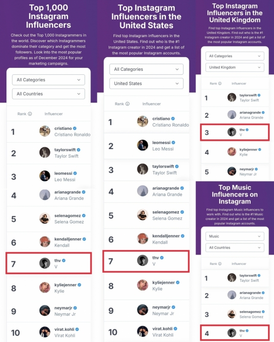 인플루언서 분석업체 하이프오디터의 2024년 지역별, 주제별 가장 영향력 있는 인플루언서 결산 발표에서 뷔는 '전 세계에서 가장 영향력 있는 인플루언서', '미국에서 가장 영향력 있는 인플루언서' 7위에 올랐다. 이는 아시아 스타로는 최고 순위이다.