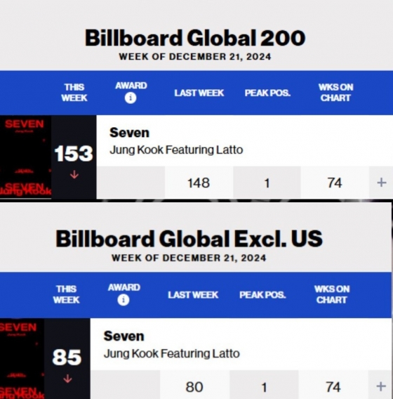 미국 음악 전문 매체 빌보드가 발표한 최신 차트(12월 21일 자)에 따르면, 정국의 솔로 싱글 'Seven'(세븐)은 '글로벌 200' 차트에서 153위를 차지했다.