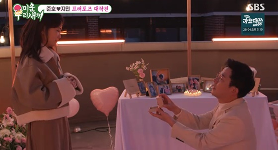 이상민의 도움을 받아 프러포즈를 준비한 김준호는 "솔직히 너를 만나기 전까지 내 인생에 '사랑'은 없다고 생각했었다. 내가 아플 때 내 옆을 지켜주는 널 보고 내 마지막 사랑이 너라는 걸 알았다. 내가 다시 누군가를 좋아하고 사랑할 수 있게 해줘서 고맙다"라고 마음을 고백했다. 이어 김준호는 "진짜 담배 끊고 술도 안 마시겠다"라며 김지민을 옥상으로 이끌었고 촛불과 장식으로 꾸민 옥상에서 본격 프러포즈를 시작했다.