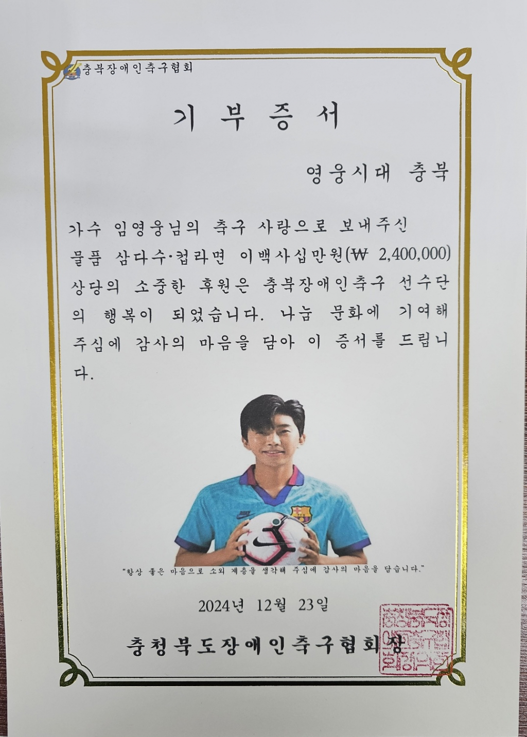 임영웅 팬클럽 '영웅시대 충북'은 12월 23일 충북장애인축구협회에 생수 1000병과 컵라면 80박스 등 240만 원 상당 물품을 전달했다.