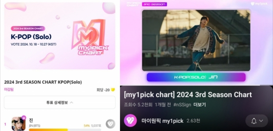진은 지난 10월 18일부터 10월 27일까지 진행한 2024년 3분기 시즌차트 투표에서 5037표(54%)를 얻어 1위를 차지했다.