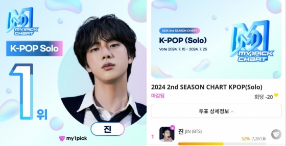 진은 지난 7월 15일부터 7월 25일까지 진행한 2분기 시즌차트에서도 7261표(52%)를 얻어 K-POP(SOLO)부문 1위를 차지했다.