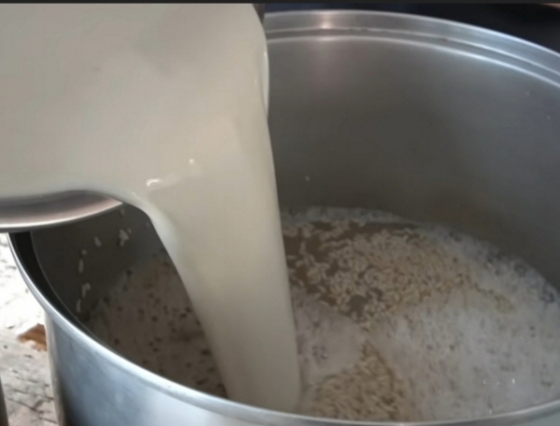 2. 쌀로 고두밥을 지어주고 밥솥에 엿기름 우린 물을 부어 밥이랑 골고루 잘 섞어준다. 황기와 엿기름 삼베 주머니도 같이 넣고 3~4시간 정도(밥알이 10개 정도 떠오르면 완성) 삭힌다.