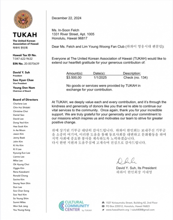 임영웅 팬클럽 '하와이 영웅시대'는 임영웅의 고척스카이돔 리사이틀 콘서트를 축하하며 12월 22일 하와이 한인회(The United Korea Association of Hawaii, TUKAH)에 미화 3500달러를 기부했다.