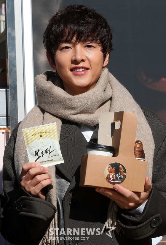 배우 송중기가 24일 오후 서울 중구 한국프레스센터 앞 광장에서 진행된 영화 '보고타: 마지막 기회의 땅' 간식차 이벤트 행사에 참석해 포즈를 취하고 있다.