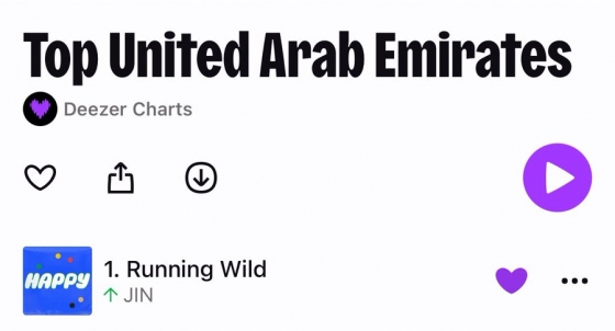 진의 'Running Wild'는 UAE 디저(Deezer) 차트에서도 다시 1위에 오르며 최고의 영향력을 보였다.