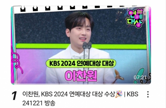 가수 이찬원이 대상 수상한 KBS 2TV '2024 KBS 연예대상 수상' 영상이 네이버 TV 1위에 오르며 인기를 빛냈다.
