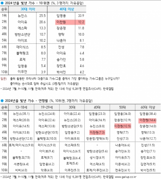 이찬원은 40대 이상에서 12.2%의 지지를 얻으며 '2024년을 빛낸 가수' 2위에 올랐다.