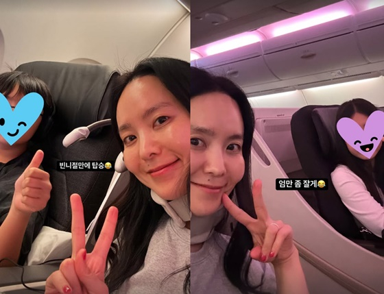 박지윤은 자녀들과 함께 비행기에 탑승한 순간을 인증하기도 했다. 특히 박지윤은 아이들과 함께 비즈니스 클래스석에 착석하고 있다.
