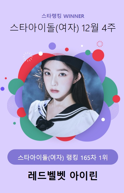 아이린은 지난 19일 오후 3시 1분부터 26일 오후 3시까지 진행된 12월 4주(165차) 스타랭킹 여자 아이돌 랭킹 투표에서 1만 6770표를 얻고 1위를 차지했다.