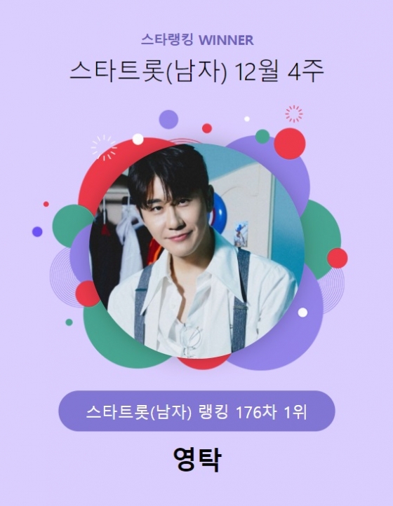 영탁은 지난 19일 오후 3시 1분부터 26일 오후 3시까지 진행된 12월 4주(176차) 스타랭킹 스타트롯 남자 랭킹에서 11만 3878표를 차지하며 굳건한 1위를 유지했다.