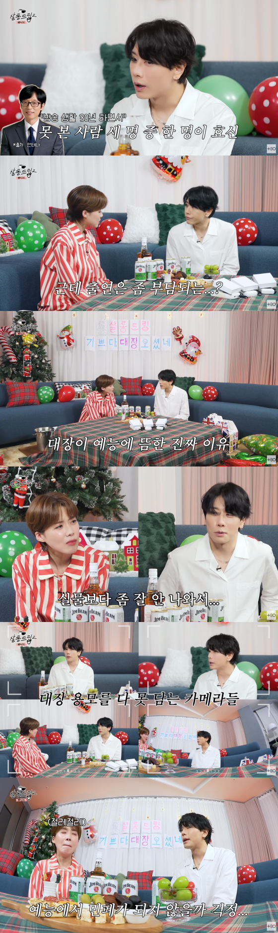 이날 장도연은 박효신에게 "유재석이 방송 생활 30년 하면서 못 본 연예인 세 명 중 한 명이 박효신이라더라. 출연은 부담이 되냐"고 물었다.