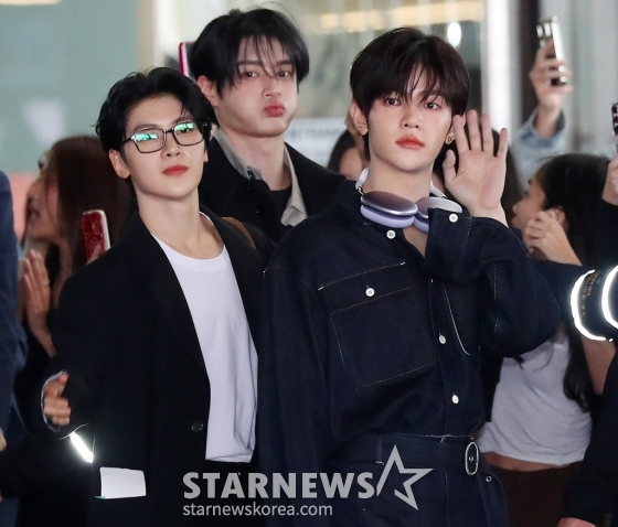 그룹 제로베이스원 석매튜, 김지웅, 장하오가 태국 방콕에서 열리는 '제 9회 아시아 아티스트 어워즈'(The 9th Asia Artist Awards, 이하 'AAA 2024')' 참석을 위해 26일 오후 수완나품 공항을 통해 입국하고 있다.