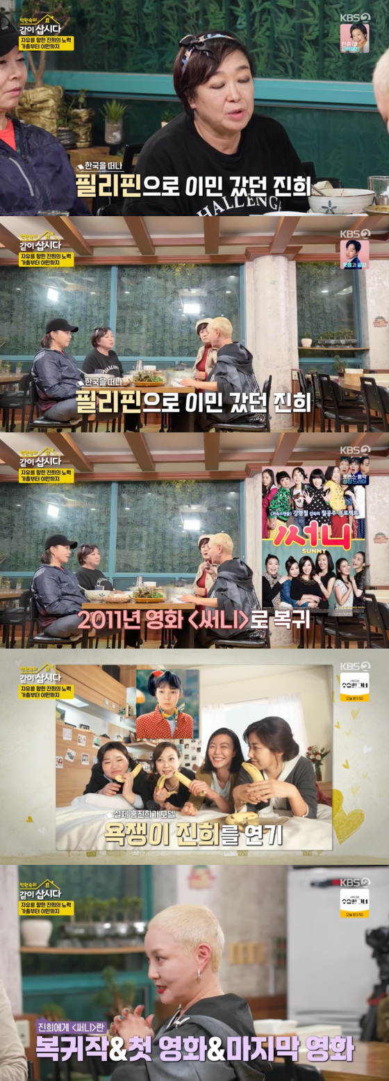 과거 필리핀으로 떠났던 홍진희는 '써니'로 복귀한 것에 대해 "복귀작이자 첫 영화이자 마지막 영화"라며 "'써니' 제안을 받았을 때도 자신이 없었다. 연기를 너무 오래 쉬지 않았나. 그런데 감독이 설득해서 찍은 것"이라고 말했다.