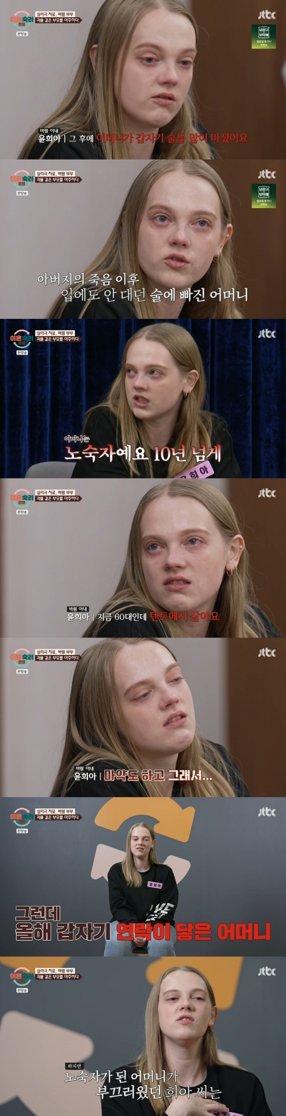 이어 그는 "아빠가 열 살 때 돌아가셨다. 심장 문제가 있었다. 그 후에 엄마가 갑자기 술을 많이 마셨다. 맨날 거의 날 때렸다. '너 때문에'라고 했다"면서 "모든 사람한테 엄마가 돌아가셨다고 거짓말했다. 사실 엄마는 10년 넘게 노숙자다. 지금 60대인데 텐트에서 산다. 마약도 한다"라고 전했다. 앞서 아내는 "2년 전에 엄마 돌아갔다"고 말한 바.