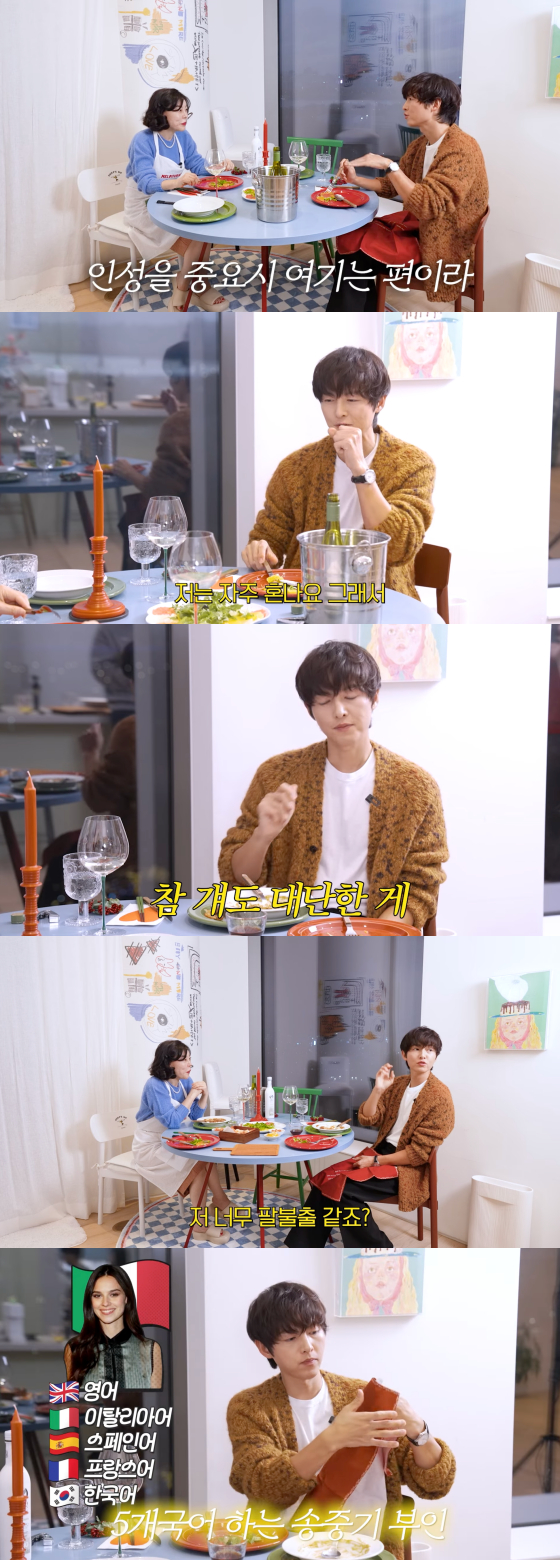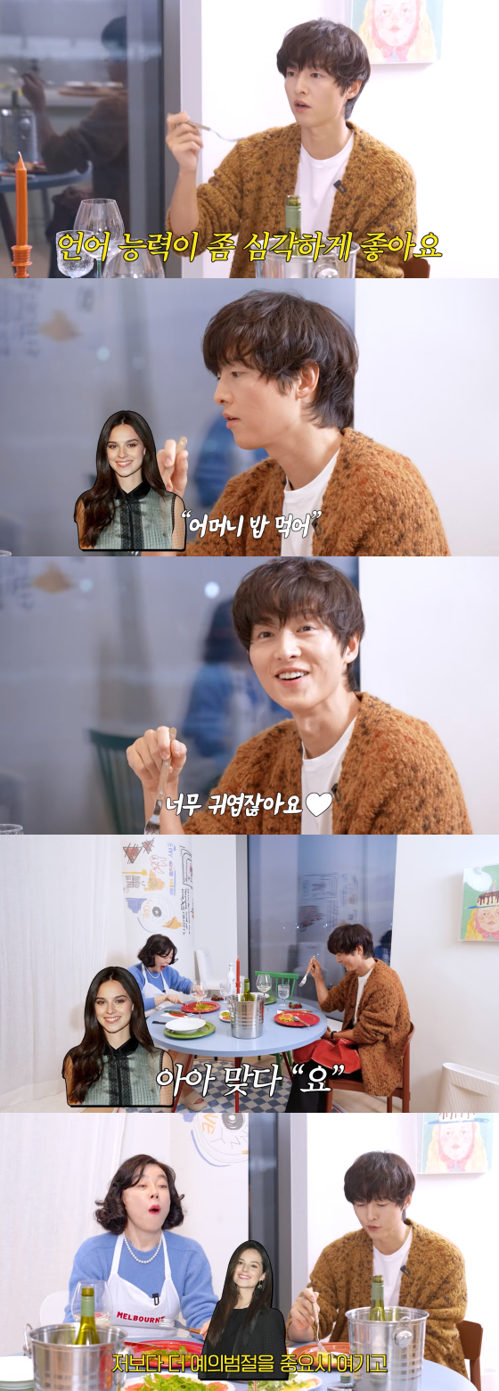 송중기의 아내 자랑은 계속됐다. 그는 "아내가 한국인인 나보다 예의범절, 인성을 중요하게 생각한다. 그래서 내가 자주 혼난다. 하루는 내가 일이 좀 있어서 매니저와의 약속에 20분 정도 늦었더니 아내가 '네가 뭔데 사람을 기다리게 하냐'면서 혼내더라. 기본적인 것을 리마인드 해 주는 스타일이다. 도움이 된다. 나 지금 너무 팔불출 같지 않냐"면서 아내에 대한 애정을 드러냈다.