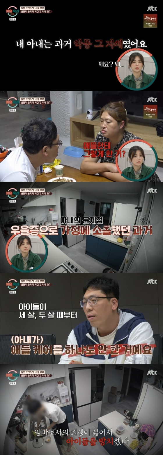 아내는 두 자녀들을 연년생으로 출산한 후 산후 우울증이 심하게 왔었다고. 남편은 "집에 오면 돼지 우리 같았다. 밥솥을 보면 72시간씩 밥이 있었다. 애들 케어를 하나도 안 했다. 세 살, 두 살 때부터"라고 말했다. 아내는 "아이들이 둘 다 막 울고 있어서 케어를 해야하는데 '왜 나만 애들을 돌봐야 하지? 엄마는 왜 희생을 해야하지?' 싶었다"라고 고백했다.
