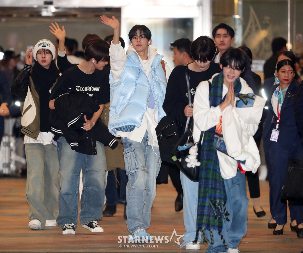 그룹 투어스(TWS, 신유, 도훈, 영재, 한진, 지훈, 경민)가 태국 방콕에서 열리는 '제 9회 아시아 아티스트 어워즈'(The 9th Asia Artist Awards, 이하 'AAA 2024')' 참석을 위해 26일 오후 수완나품 공항을 통해 입국하고 있다.