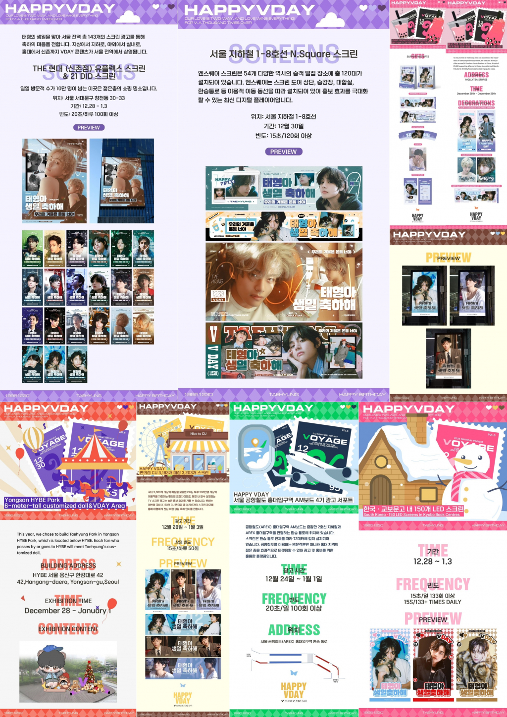 홍대에서 신촌까지 지상과 지하, 야외와 실내까지 생일 콘텐츠가 상영된다. 신촌 현대백화점, 유플렉스의 스크린, 21개의 DID 스크린, 1호선에서 8호선까지 전역에 설치된 N 스퀘어 스크린 120대, 홍대 스칼렛 LED 스크린 등 총 143개의 스크린 광고를 게재해 뷔의 생일을 홍보하고 축하할 예정이다.