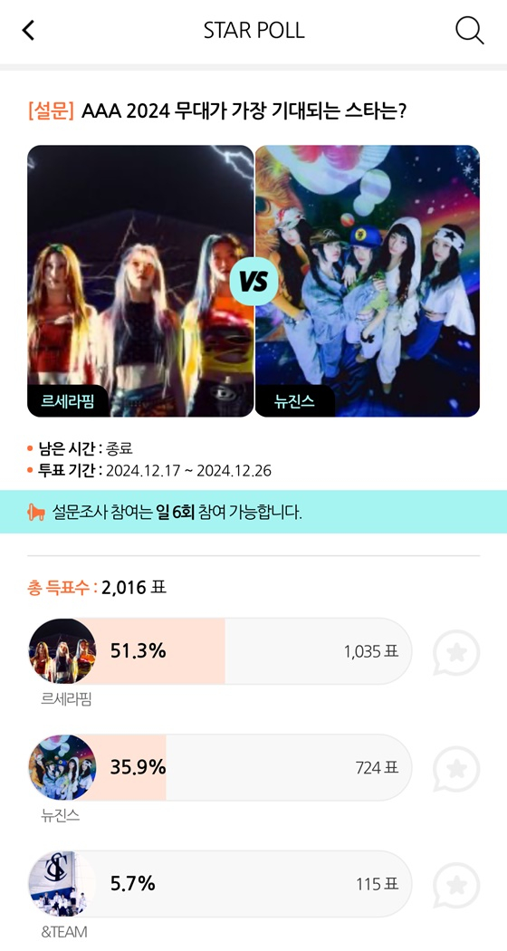르세라핌은 총 득표수 2016표 중 51.3%에 해당하는 1035표를 얻으며 1위를 차지했다. 그의 뒤를 이어 2위 뉴진스(724표), 3위 &TEAM(115표) 등이 이름을 올렸다.