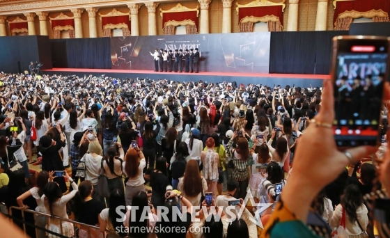 27일 오후 태국 방콕 임팩트 챌린저 홀 1-2(IMPACT Challenger Hall 1-2)에서 진행된 '제9회 아시아 아티스트 어워즈'(The 9th Asia Artist Awards, 이하 'AAA 2024') 레드카펫 행사에 세계 각국의 팬들과 취재진이 모여 있다.