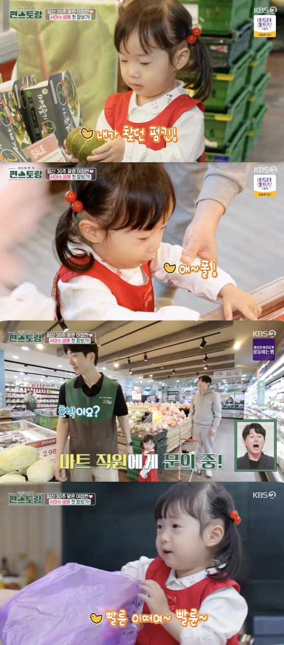 서아는 장 보기 중 '만 2세'라고는 믿기지 않을 유창한 영어 실력을 자랑하기도 했다. 재료들을 정확히 "펌킨(Pumkin), 워터멜론(Watermelon), 애플(Apple)"라고 발음해 모두를 놀라게 한 것.