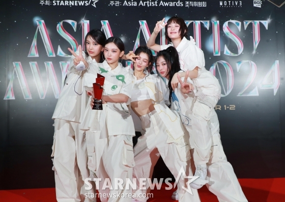 걸그룹 뉴진스가 27일 오후 태국 방콕 임팩트 챌린저 홀 1-2(IMPACT Challenger Hall 1-2)에서 진행된 '제9회 아시아 아티스트 어워즈'(The 9th Asia Artist Awards, 이하 'AAA 2024')에서 AAA 베스트퍼포먼스상을 수상한 뒤 포즈를 취하고 있다.