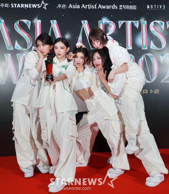 걸그룹 뉴진스가 27일 오후 태국 방콕 임팩트 챌린저 홀 1-2(IMPACT Challenger Hall 1-2)에서 진행된 '제9회 아시아 아티스트 어워즈'(The 9th Asia Artist Awards, 이하 'AAA 2024')에서 AAA 베스트퍼포먼스상을 수상한 뒤 포즈를 취하고 있다.
