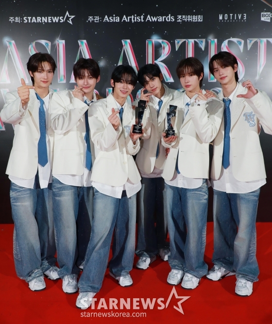 그룹 투어스가 27일 오후 태국 방콕 임팩트 챌린저 홀 1-2(IMPACT Challenger Hall 1-2)에서 진행된 '제9회 아시아 아티스트 어워즈'(The 9th Asia Artist Awards, 이하 'AAA 2024')에서 AAA 베스트 아티스트, 신인상을 수상한 뒤 포즈를 취하고 있다.