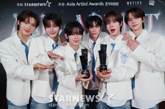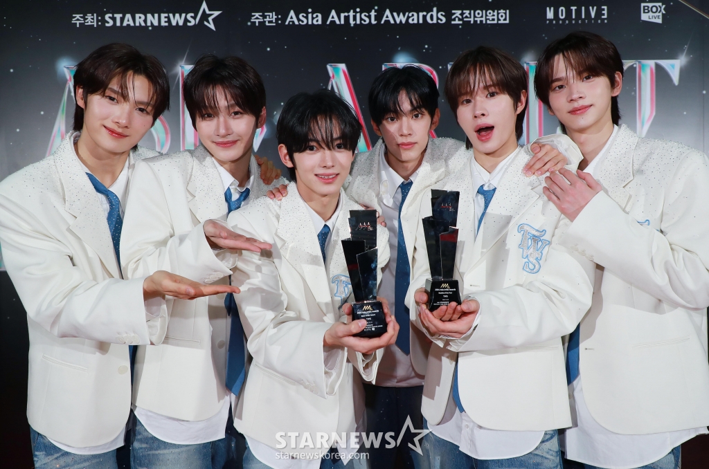 그룹 투어스가 27일 오후 태국 방콕 임팩트 챌린저 홀 1-2(IMPACT Challenger Hall 1-2)에서 진행된 '제9회 아시아 아티스트 어워즈'(The 9th Asia Artist Awards, 이하 'AAA 2024')에서 AAA 베스트 아티스트, 신인상을 수상한 뒤 포즈를 취하고 있다.