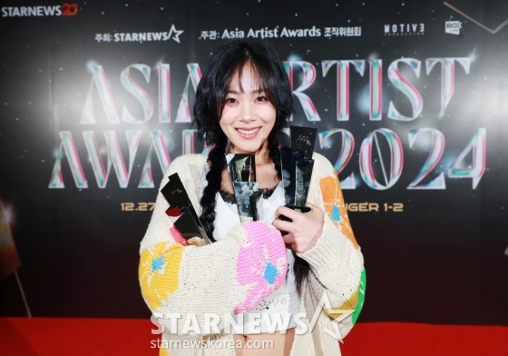 가수 비비(김형서)가 27일 오후 태국 방콕 임팩트 챌린저 홀 1-2(IMPACT Challenger Hall 1-2)에서 진행된 '제9회 아시아 아티스트 어워즈'(The 9th Asia Artist Awards, 이하 'AAA 2024')에서 AAA 뉴 웨이브상, 베스트 뮤지션 솔로, 베스트 아티스트상을 수상한 뒤 포즈를 취하고 있다.