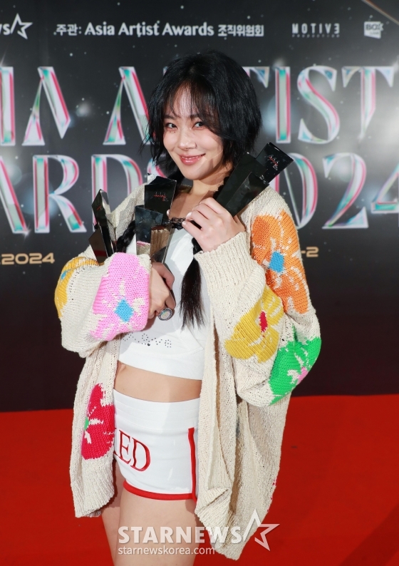 가수 비비(김형서)가 27일 오후 태국 방콕 임팩트 챌린저 홀 1-2(IMPACT Challenger Hall 1-2)에서 진행된 '제9회 아시아 아티스트 어워즈'(The 9th Asia Artist Awards, 이하 'AAA 2024')에서 AAA 뉴 웨이브상, 베스트 뮤지션 솔로, 베스트 아티스트상을 수상한 뒤 포즈를 취하고 있다.