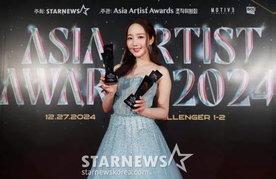배우 박민영이 27일 오후 태국 방콕 임팩트 챌린저 홀 1-2(IMPACT Challenger Hall 1-2)에서 진행된 '제9회 아시아 아티스트 어워즈'(The 9th Asia Artist Awards, 이하 'AAA 2024')에서 AAA 베스트 아티스트, 올해의 배우 여자부문을 수상한 뒤 포즈를 취하고 있다.