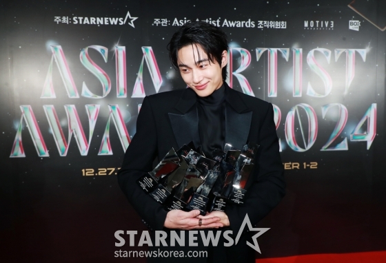 배우 변우석이 27일 오후 태국 방콕 임팩트 챌린저 홀 1-2(IMPACT Challenger Hall 1-2)에서 진행된 '제9회 아시아 아티스트 어워즈'(The 9th Asia Artist Awards, 이하 'AAA 2024')에서 AAA 파퓰리티, 아시아 셀러브리티, 베스트 아티스트, 베스트 커플, 베스트 OST, 올해의 남우주연상을 수상한 뒤 포즈를 취하고 있다.