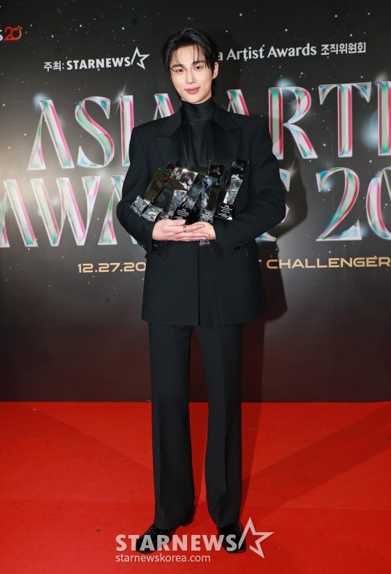 배우 변우석이 27일 오후 태국 방콕 임팩트 챌린저 홀 1-2(IMPACT Challenger Hall 1-2)에서 진행된 '제9회 아시아 아티스트 어워즈'(The 9th Asia Artist Awards, 이하 'AAA 2024')에서 AAA 파퓰리티, 아시아 셀러브리티, 베스트 아티스트, 베스트 커플, 베스트 OST, 올해의 남우주연상을 수상한 뒤 포즈를 취하고 있다.