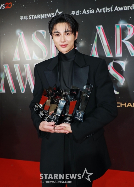 배우 변우석이 27일 오후 태국 방콕 임팩트 챌린저 홀 1-2(IMPACT Challenger Hall 1-2)에서 진행된 '제9회 아시아 아티스트 어워즈'(The 9th Asia Artist Awards, 이하 'AAA 2024')에서 AAA 파퓰리티, 아시아 셀러브리티, 베스트 아티스트, 베스트 커플, 베스트 OST, 올해의 남우주연상을 수상한 뒤 포즈를 취하고 있다.