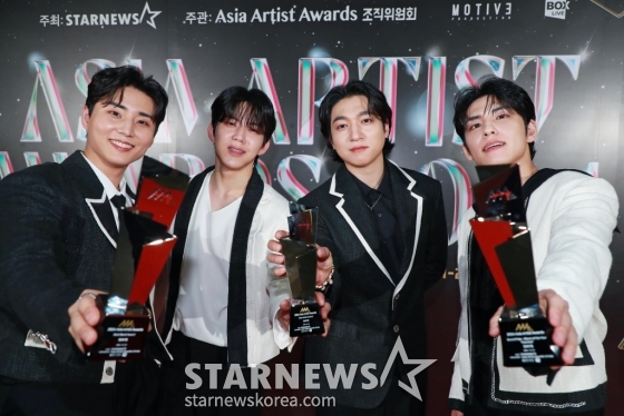 밴드 데이식스가 27일 오후 태국 방콕 임팩트 챌린저 홀 1-2(IMPACT Challenger Hall 1-2)에서 진행된 '제9회 아시아 아티스트 어워즈'(The 9th Asia Artist Awards, 이하 'AAA 2024')에서 AAA 올해의 앨범, 베스트 밴드, 베스트 아티스트상을 수상한 뒤 포즈를 취하고 있다.