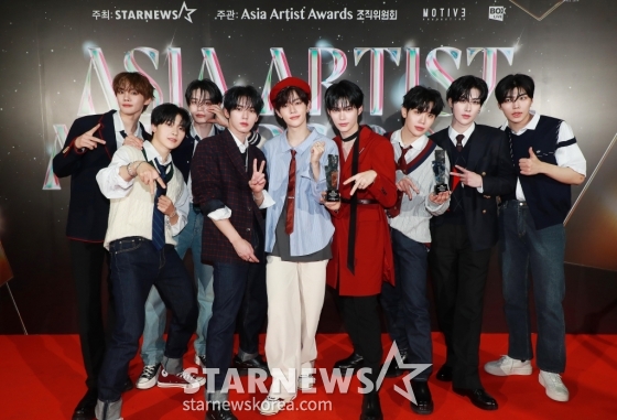 그룹 제로베이스원이 27일 오후 태국 방콕 임팩트 챌린저 홀 1-2(IMPACT Challenger Hall 1-2)에서 진행된 '제9회 아시아 아티스트 어워즈'(The 9th Asia Artist Awards, 이하 'AAA 2024')에서 AAA 베스트 아티스트, 베스트 뮤지션 그룹상을 수상한 뒤 포즈를 취하고 있다.