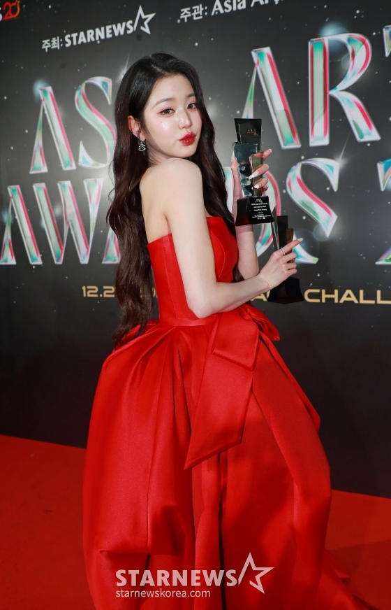 아이브 장원영이 27일 오후 태국 방콕 임팩트 챌린저 홀 1-2(IMPACT Challenger Hall 1-2)에서 진행된 '제9회 아시아 아티스트 어워즈'(The 9th Asia Artist Awards, 이하 'AAA 2024')에서 AAA 아시아 셀러브리티, 퀸 오브 AAA와 아이브의 베스트 아티스트 상을 수상한 뒤 포즈를 취하고 있다.