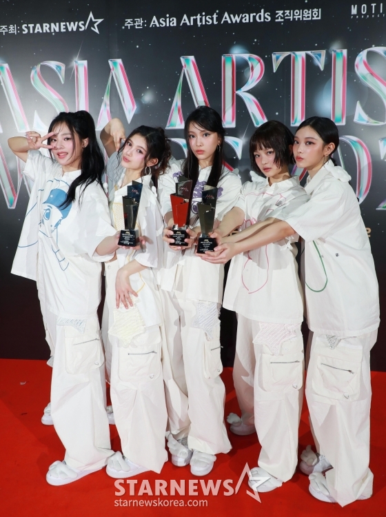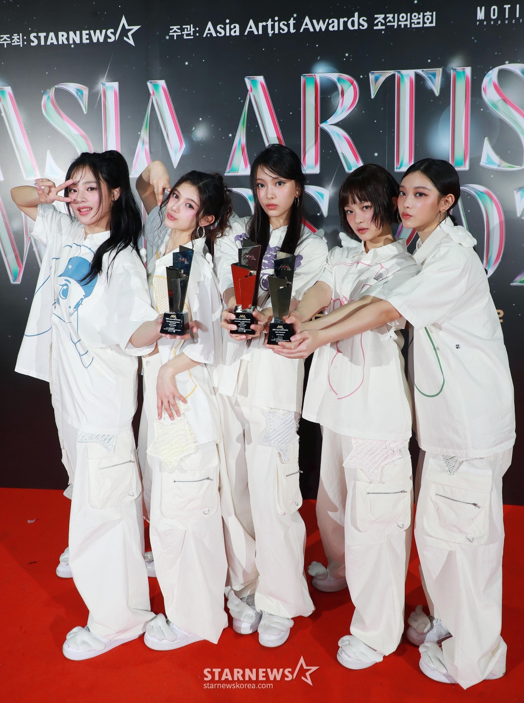 걸그룹 뉴진스가 27일 오후 태국 방콕 임팩트 챌린저 홀 1-2(IMPACT Challenger Hall 1-2)에서 진행된 '제9회 아시아 아티스트 어워즈'(The 9th Asia Artist Awards, 이하 'AAA 2024')에서 AAA 베스트 아티스트, 베스트 퍼포먼스, 올해의 가수상을 수상한 뒤 포즈를 취하고 있다.