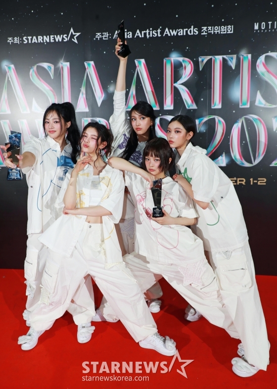 걸그룹 뉴진스가 27일 오후 태국 방콕 임팩트 챌린저 홀 1-2(IMPACT Challenger Hall 1-2)에서 진행된 '제9회 아시아 아티스트 어워즈'(The 9th Asia Artist Awards, 이하 'AAA 2024')에서 AAA 베스트 아티스트, 베스트 퍼포먼스, 올해의 가수상을 수상한 뒤 포즈를 취하고 있다.