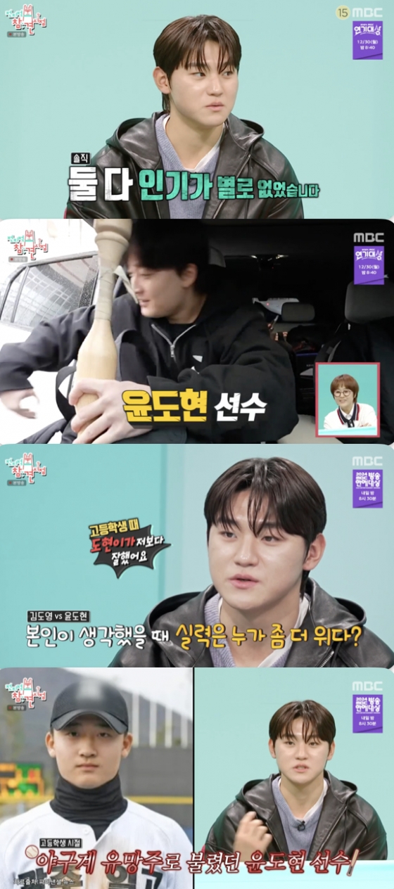 전현무가 "(윤도현 선수와 본인 중에서) 솔직히 본인이 생각했을 때 실력이 누가 더 위냐"라고 물었다. 그러자 김도영은 "(윤)도현이가 저보다 더 잘했다. 저는 전국체전에서 잘해서 빵 뜬 스타일이다. 도현이는 아마추어 때 저보다 더 잘하기로 유명했다"라고 겸손한 모습을 보였다.