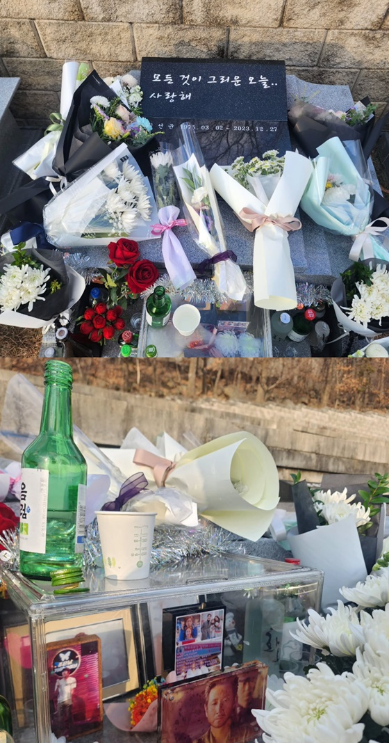 생전 이선균이 웃음 짓는 모습이 담긴 사진도 포착됐다. 묘비에는 '모든 것이 그리운 오늘.. 사랑해'라는 문구가 적혀 있다.