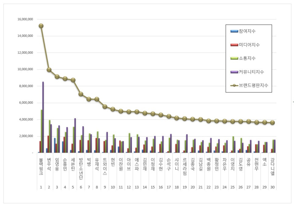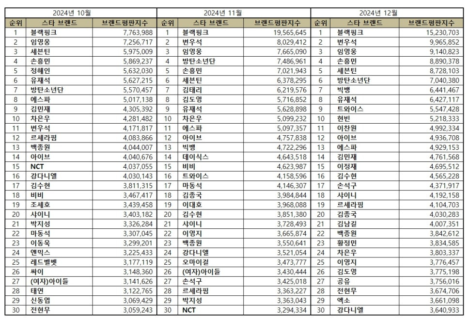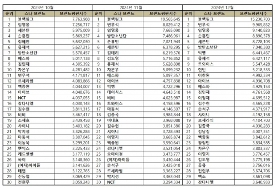 2024년 12월 스타 브랜드평판 30위 순위는 블랙핑크, 변우석, 임영웅, 방탄소년단, 손흥민, 세븐틴, 김태리, 김도영, 유재석, 차은우, 에스파, 아이브, 빅뱅, 데이식스, 비비, 트와이스, 마동석, 김종국, 이대호, 김수현, 샤이니, 이영지, 백종원, 강다니엘, 오마이걸, (여자)아이들, 손석구, 르세라핌, 박지성, NCT 순으로 분석됐다.